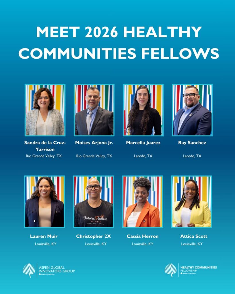 Washington, DC, April 9, 2026 – The Aspen Global Innovators Group (AGI) is proud to announce the selection of its eighth cohort of the Healthy Communities Fellowship. The 2026 Healthy Communities Fellows come from the Rio Grande Valley, Texas; Laredo, Texas; and Louisville, Kentucky, bringing expertise in diabetes prevention, maternal health, food security, healthcare access, and mental health. Since its inception, the Healthy Communities Fellowship has built a powerful network of 50+ leaders across the country, working in 17 communities. These fellows are part of AGI’s broader global network, which spans more than 54 countries and has collectively reached over 200 million individuals through fellow-led programs, policy change, and direct services.