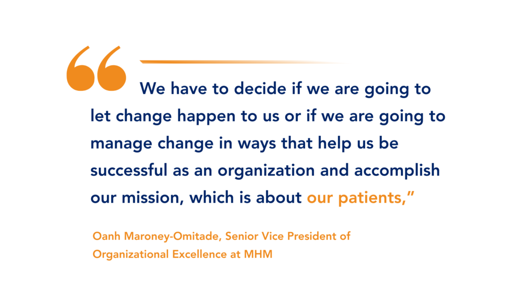 Officials with the Baldrige Foundation, the U.S. Department of Commerce, and the National Institute of Standards and Technology (NIST) presided over the award ceremony and presented the six organizations with their respective awards and recognitions. Representing MHM on stage was Oanh Maroney‑Omitade, Senior Vice President of Organizational Excellence. “When I stop and think about all the things we have done over just the past five years, it’s been phenomenal, and it has helped us become better as an organization,” she said.
